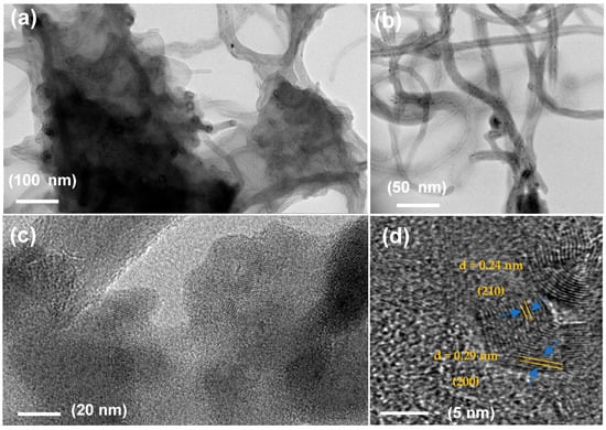 The nanostructure and compositional properties of the NiP@PNC/NF electrode were thoroughly investigated using high-resolution transmission electron microscopy (HR-TEM) at various magnifications, with detailed images showcased in Figure 3. As depicted in Figure 3a, a low-magnification TEM image reveals the intricate interplay between NiP nanoparticles and PNC within the electrode. The P, N co-doped CNTs appear as elongated, hollow tubular structures with smooth external surfaces, interspersed with occasional structural defects such as kinks, bends, or lattice distortions. These imperfections, induced by the incorporation of phosphorus and nitrogen heteroatoms into the carbon framework, significantly enhance the electrocatalytic performance of the CNTs by creating additional active sites and improving electronic conductivity through modified electronic states. The NiP nanoparticles are observed to be firmly anchored to the CNT surfaces, with some particles partially embedded within the CNT matrix, demonstrating strong interfacial bonding that promotes structural stability. This intimate NiP–PNC interaction facilitates efficient charge transfer, a critical factor in boosting the electrode’s electrocatalytic activity for UOR. Figure 3b, a high-magnification TEM image, provides a closer look at the NiP@PNC/NF electrode’s hybrid structure, highlighting the fine details of the NiP shell’s uniform coating over the PNC nanotubes and the nuanced compositional integration, further underscoring the material’s tailored design for enhanced electrocatalytic performance. Figure 3c,d present HR-TEM images of the NiP@PNC/NF sample. The observed lattice spacing of the crystalline nanoparticles is approximately 0.29 nm and 0.24 nm, which corresponds well with the characteristic (200) and (210) plane of NiP, as reported in the literature [35,36,37,38]. This observation further confirms the crystalline nature of the NiP phase in our synthesized material and supports its structural assignment.