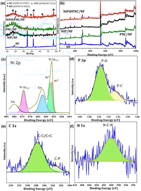 The X-ray diffraction (XRD) patterns for four electrode materials—bare nickel foam (NF), NiP/NF, PNC/NF, and NiP@PNC/NF—collected using a Cu Kα radiation source (λ = 1.5406 Å) throughout a 2θ range of 17° to 80° are shown in Figure 4a. The contributions of the NF substrate, nickel phosphide (NiP), and phosphorus and nitrogen co-doped carbon nanotubes (PNCs) to the architecture of the hybrid material are clarified by these patterns, which offer comprehensive insights into the crystallographic phase composition, crystallinity, and structural characteristics of each electrode. According to JCPDS card no. 01-1260, the XRD pattern of the uncoated NF substrate, represented by the green line, shows three distinct, sharp diffraction peaks at roughly 43.2°, 50.8°, and 74.7°. These peaks correspond to the (111), (200), and (220) planes of face-centered cubic (FCC) metallic nickel [38,39]. The NiP/NF electrode, shown by the black line, has three prominent NF peaks at 43.2°, 50.8°, and 74.7°, as well as two weaker peaks at about 38.1° and 48.3° that correspond to the (200) and (211) planes of orthorhombic NiP, according to JCPDS card no. 03-0953 [40]. These XRD patterns show the structural features of the NiP coating on the NF substrate. The complex composition of this hybrid material, which integrates P, N co-doped CNTs with NiP on the NF substrate, is reflected in the red line of the NiP@PNC/NF electrode’s XRD pattern. The diffraction signal is dominated by the high crystallinity and structural integrity of the NF substrate, as seen by the retention of the distinctive NF peaks at 43.2°, 50.8°, and 74.7°. Furthermore, as shown in JCPDS card no. 89-7213 [41], a broad, low-intensity peak at roughly 27.3° corresponds to the (002) plane of hexagonal graphitic carbon, verifying the existence of PNC within the electrode. This peak’s widening indicates a somewhat disordered graphitic structure, most likely brought on by lattice strain and defects brought on by the CNTs’ doping with nitrogen and phosphorus. The total efficiency of the NiP@PNC/NF electrode for urea oxidation and hydrogen production is increased by these structural flaws, which also improve the electronic characteristics and electrocatalytic performance of the CNTs by generating more active sites.