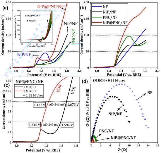 The electrocatalytic performances of four electrode configurations—bare NF, NiP/NF, PNC/NF, and NiP@PNC/NF—are compared in Figure 5a, which shows detailed current density versus voltage (j-v) plots for the OER carried out in a 1.0 M KOH electrolyte (pH 13.6). The catalysts’ OER efficiencies are comprehensively visualized by these linear sweep voltammetry (LSV) curves, which also show clear variations in their electrocatalytic activity under the same experimental setup. The figures show how the structural and compositional characteristics of each electrode affect its capacity to support the OER, a crucial procedure for uses like water splitting in alkaline electrolyzers. The same set of electrodes—NF, NiP/NF, PNC/NF, and NiP@PNC/NF—is evaluated in Figure 5b, which also shows j-v plots for the UOR carried out in an electrolyte made of 1.0 M KOH with 0.33 M urea. The UOR is an alternate anodic reaction that can lower energy requirements in electrochemical systems, and these curves show how well the catalysts function in catalyzing it. In comparison with the RHE, the NiP@PNC/NF electrode exhibits remarkable UOR performance, with an astonishingly high current density of 100 mA cm−2 at 1.43 V. The improved activity of the hybrid catalyst is shown by the fact that this current density is more than three times greater than that of the bare NF electrode at the same voltage. Additionally, in comparison with its counterparts, the NiP@PNC/NF electrode shows a much lower onset potential for OER, indicating lower energy barriers for starting the reaction and improved catalytic efficiency. Furthermore, LSV curves for the NiP@PNC/NF electrode in 1.0 M KOH, with and without 0.33 M urea, measured at a scan rate of 20 mV s−1 are included in Figure 5b. The performance of the electrode under OER and UOR conditions can be directly compared, thanks to these graphs. At high lower potential 1.34 V vs. RHE, the NiP@PNC/NF electrode obtains current densities of 50 mA cm−2 and 100 mA cm−2 at 1.43 V for UOR. The improved electrocatalytic efficiency of the NiP@PNC/NF electrode is demonstrated by this comparison. The electrochemical conversion of Ni2+ to Ni3+, a feature of nickel-based electrocatalysts, is responsible for an oxidation peak seen in the LSV curves at about 1.31 V vs. RHE. This process probably enhances the catalytic activity by promoting redox reactions at the electrode surface. Results from EIS at 1.45 V in 1.0 M KOH with 0.33 M urea are shown in Figure 5c, providing information on the electrodes’ charge transfer characteristics. Compared with the other electrodes examined, the NiP@PNC/NF electrode has an extraordinarily low charge transfer resistance (Rct) of 2.52 Ω. For effective electrocatalytic performance, this low Rct value denotes improved electrical conductivity and quicker charge-transfer kinetics. The hybrid NiP@PNC/NF architecture’s enhanced active site accessibility and optimized electrical structure are probably the causes of the decreased resistance.