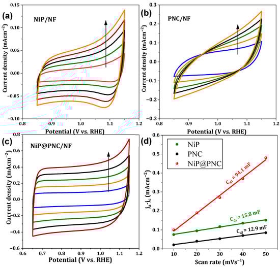 This figure shows capacitive current measurements in 1.0 M KOH for NiP/NF (a), PNC/NF (b), and NiP@PNC/NF (c), along with the correlation between double-layer capacitances and various scan rates for the prepared catalysts (d).