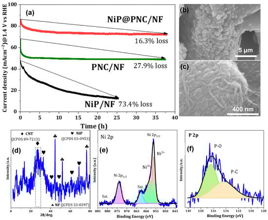 (a) displays the long-term stability test results for NiP/NF, PNC/NF, and NiP@PNC/NF catalysts at 1.4 V versus RHE, evaluating their stability over extended operation. (b–f) display FE-SEM images, XRD patterns, and high-resolution XPS spectra of the Ni 2p and P 2p regions for NiP@PNC/NF after the stability test. Post-stability HRTEM analysis reveals no observable changes in the surface morphology or structural characteristics of the catalyst. The XRD patterns further confirm that the crystalline structure remains intact, while the XPS results indicate no significant loss of key elements or alterations in surface chemical states.