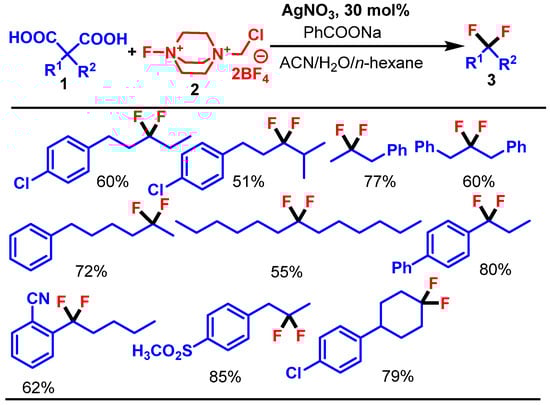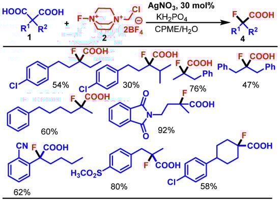 In 2019, Wang et al. reported the synthesis of gem-difluoroalkanes 3 and α-fluorocarboxylic acids 4 through the silver-catalyzed chemoselective decarboxylative fluorination of the malonic acid derivatives 1, using Selectfluor 2 as fluorine source. This study introduces a novel AgNO3-catalyzed radical decarboxylative fluorination protocol that enables chemoselective synthesis of either α-fluorocarboxylic acids 4 or gem-difluoroalkanes 3 from the malonic acid derivatives 1 [].