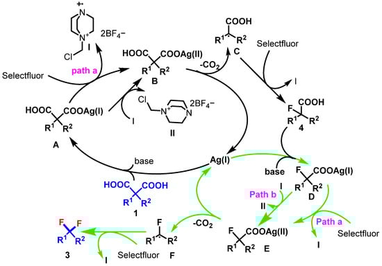 The process begins with the formation of a silver(I) salt A from the malonic acid 1 in the presence of a weak base. This salt is oxidized by Selectfluor to produce Ag(II) B and a fluorine radical (path a). Next, the carboxylate moiety B undergoes single-electron oxidation by Ag(II), leading to decarboxylation and the formation of an α-carboxylic acid radical (intermediate C). This radical then abstracts a fluorine atom from Selectfluor to form an α-fluorocarboxylic acid (4). A second decarboxylative step E occurs for gem-difluorination: compound 4 further reacts to give the radical intermediate F that, after fluorine abstraction, forms product 2 (Scheme 3).