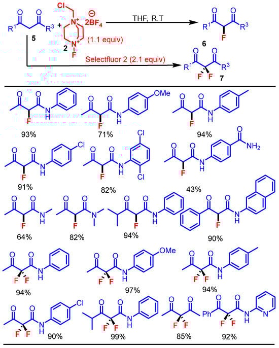 This transformation involves treating the 1,3-dicarbonyl compounds 5 (e.g., 3-oxo-N-phenylbutanamide) with Selectfluor 2 in a 1:1 mixture of CH3CN and water. To obtain the monofluorinated product 6, the reaction is carried out with 1.1 equiv of Selectfluor 2, and the mixture is stirred at room temperature for 4 h, producing the 2-fluoro-1,3-dicarbonyl products 6 in yields up to 93%. To prepare the difluorinated compound 7, 2.1 equiv of Selectfluor 2 is used under the same solvent system and temperature conditions, but with an extended reaction time of 16 h, affording the 2,2-difluoro products 7 in yields as high as 99% (Scheme 4).