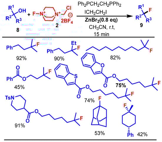 In 2020, Zhang et al. reported the synthesis of tertiary alkyl fluorides 9 via a dehydroxylative fluorination protocol using Selectfluor (2) and a Ph2PCH2CH2PPh2/ICH2CH2I activation system. Their work introduces an efficient and rapid method for the dehydroxylative fluorination of tertiary alcohols (8), a transformation that has long posed challenges due to the steric hindrance and instability of tertiary carbocations. The authors designed a mild and redox-compatible system using Selectfluor (2) as the fluorinating agent and Ph2PCH2CH2PPh2/ICH2CH2I to activate the hydroxyl group, supported by ZnBr2 serving as halide source [].