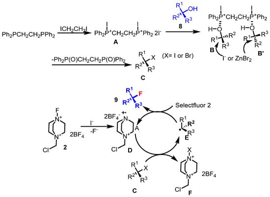 This process starts with the reaction of Ph2PCH2CH2PPh2 and ICH2CH2I to form intermediate A, a diiodophosphonium salt [Ph2P+(I)CH2CH2P+(I)Ph2]2I− that activates the hydroxyl group of the tertiary alcohol 8. This leads to in situ halogenation, forming a tertiary iodide or bromide intermediate B or B’. Simultaneously, Selectfluor 2 oxidizes the iodide to produce radical cation D, which abstracts a halogen atom from intermediate C, generating the tertiary alkyl radical E. The latter then reacts with another equivalent of Selectfluor to yield the final fluorinated product 9 (Scheme 6).