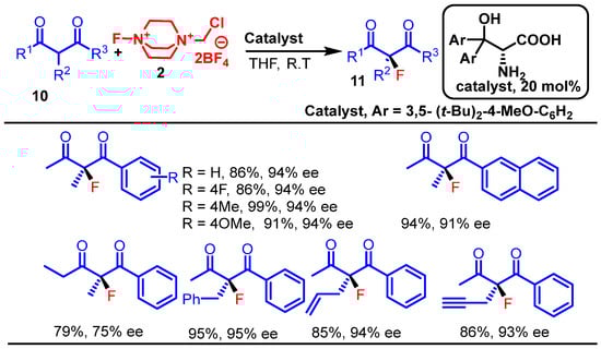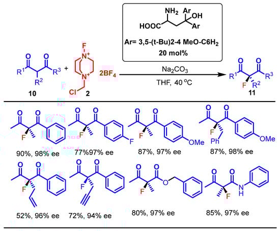 In 2022, Poorsadeghi et al. reported the synthesis of enantioenriched α-fluorinated β-diketones 11 using β,β-diaryl serines, serving as primary amine organocatalysts in a highly enantioselective fluorination reaction. Their work demonstrates an efficient organocatalytic method for the enantioselective electrophilic fluorination of α-substituted β-diketones using custom-designed β,β-diaryl serines. The reaction proceeds with high yields (74–99%) and excellent enantioselectivities (up to 94% ee) using Selectfluor under mild conditions [].