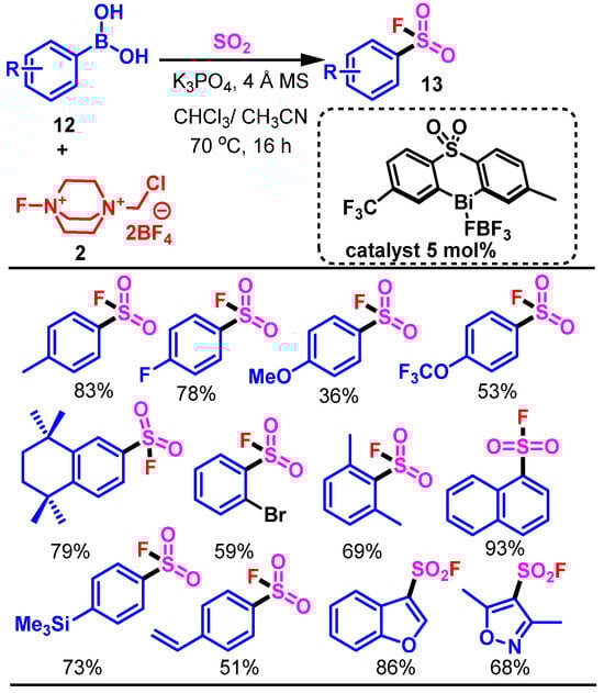 The key transformation involves the reaction of the aryl boronic acids 12 with sulfur dioxide (1.5 bar) in the presence of the Bi(III) catalyst B (5 mol%), Selectfluor 2 as oxidant, K3PO4 as base, and 4 Å molecular sieves in a solvent mixture of CHCl3/CH3CN (5:1) at 70 °C for 16 h. Under these conditions, a wide variety of aryl and heteroaryl boronic acids are converted to the corresponding sulfonyl fluorides in moderate to excellent yields. In cases where heterocycles are used, a modified protocol using the Bi catalyst 4 and NFSI as a milder oxidant leads to improved performances (Scheme 8).