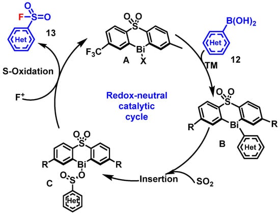 The proposed mechanism begins with the Bi(III) catalyst undergoing transmetalation with the aryl boronic acid 12 to give the triarylbismuth species B. Then, the sulfur dioxide insertion into the Bi–C(sp2) bond of B generates the bismuth sulfinate intermediate C, which adopts an O-bound coordination mode due to the oxophilicity of bismuth. Intermediate C is subsequently oxidized at the sulfur (not bismuth) center by Selectfluor 2, yielding the final sulfonyl fluoride product 13 and regenerating the A catalyst (Scheme 9).
