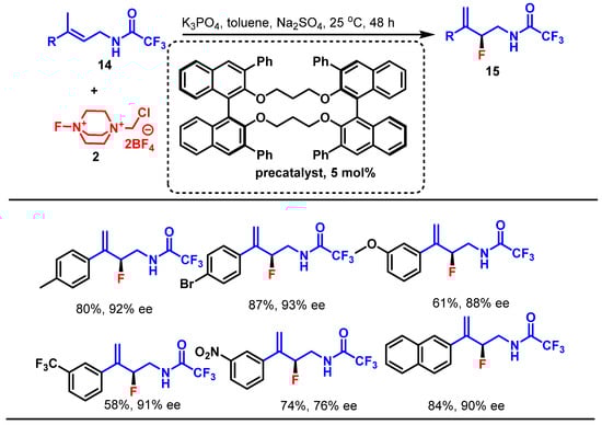 Synthesis of γ-substituted fluorinated allylamine derivatives 15 from γ-substituted allylamine derivatives 14 and Selectfluor 2 using chiral dicarboxylic acid precatalyst.