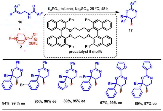 This reaction involves treating γ-substituted allylamine derivatives (14) with Selectfluor 2 (2 equiv) as the electrophilic fluorinating agent in the presence of a chiral dicarboxylic acid precatalyst (5 mol%), converted in situ to a dianionic phase-transfer catalyst using KOH (2 equiv). This reaction is typically conducted in toluene at room temperature for 24 h. Using γ,γ-disubstituted substrates (14), the process yields highly enantioenriched allylic fluorides (15), while γ-monosubstituted substrates (16) undergo cyclization to produce dihydrooxazines (17). The outcome depends on the substitution pattern and influences both the mechanism and the enantioselectivity (Scheme 10 and Scheme 11).