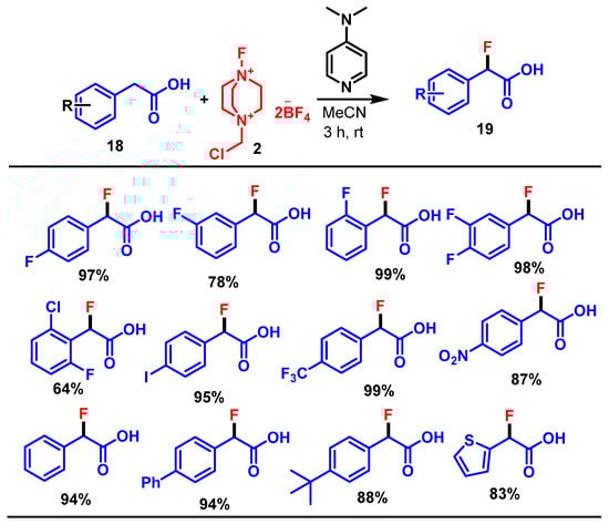 In 2022, Madani et al. reported the solvent-dependent benzylic fluorination of the phenylacetic acid derivatives 18 using Selectfluor 2 and 4-(dimethylamino)pyridine (DMAP), mediated by a charge–transfer complex. Their method enables divergent C–F bond formation pathways via radical mechanisms under aqueous or nonaqueous conditions. In particular, their study presents a novel strategy employing a charge–transfer complex between Selectfluor 2 and DMAP to direct the fluorination of the phenylacetic acids 19. In aqueous solvents, the reaction proceeds via decarboxylative fluorination, yielding benzylic fluorides, while α-fluoro-α-arylcarboxylic acids (19) are formed under dry conditions [].