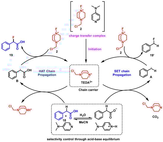 The process begins with the formation of a charge–transfer complex between DMAP and Selectfluor, forming a labile and reactive TEDA2+• chain carrier that is used as a SET or HAT process. In an aqueous medium, this adduct undergoes single-electron transfer (SET) with the phenylacetic acid substrate, generating a benzylic radical A after decarboxylation. Then, this radical undergoes fluorine atom transfer from Selectfluor 2, yielding the benzylic fluorination product 19′. In a dry medium, electrophilic fluorination occurs at the α-position without decarboxylation, likely via direct interaction between the DMAP-activated Selectfluor 2 and the phenylacetic acid derivative 19 (Scheme 13).