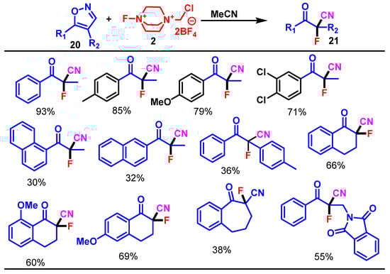 In 2022, Komatsuda et al. reported the ring-opening fluorination of isoxazoles using Selectfluor 2, leading to the α-fluorocarbonyl compounds 21 through N–O bond cleavage. The authors developed a ring-opening fluorination protocol for C3-unsubstituted isoxazoles using Selectfluor 2 under thermal conditions; this reaction involves initial electrophilic fluorination followed by N–O bond cleavage and C3 deprotonation, yielding the α-fluorinated carbonyl compounds 21 [].