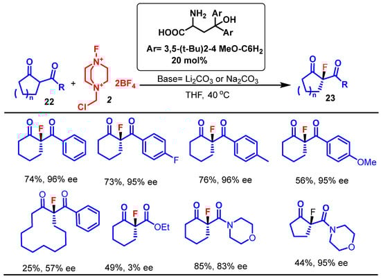 Endo et al. reported a highly enantioselective α-fluorination protocol for both the cyclic and acyclic β-dicarbonyl compounds 23 and 11, including β-diketones, β-ketoesters, and β-ketoamides, using a bulky β,β-diaryl serine primary amine catalyst and Selectfluor 2 as the fluorinating agent. The reaction employs β,β-diaryl serine catalysts and is significantly improved by the addition of alkali metal carbonates, i.e., Li2CO3 or Na2CO3 [].