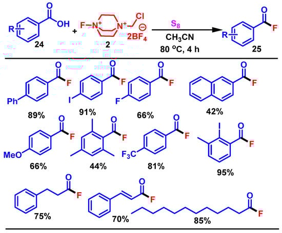 In 2023, Mahmoud et al. introduced a novel elemental sulfur-mediated protocol using Selectfluor, which enabled the direct, efficient, and metal-free transformation of the carboxylic acids 24 into the acyl fluorides 25 with high selectivity and broad functional group compatibility. Their study demonstrates a transition-metal-free, sulfur-mediated method for synthesizing acyl fluorides from carboxylic acids using Selectfluor 2. Unlike previous methods that produced acid anhydrides or required derivatization, this reaction proceeds directly and selectively [].