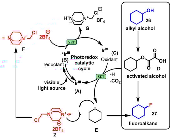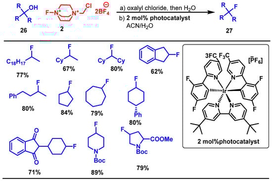 González-Esguevillas et al. in 2023 reported the synthesis of fluoroalkanes via a visible-light-driven deoxyfluorination of alcohols 26, employing photoredox catalysis to facilitate the reaction of activated alcohol derivatives (alkyl oxalates) with Selectfluor 2®. This transformation involves the photoredox-catalyzed transformation of alkyl oxalates with Selectfluor 2® using an iridium photocatalyst such as Ir[dF(CF3)ppy]2(dtbbpy)PF6 (1–2 mol%) in a mixed solvent system (e.g., acetone/H2O or MeCN/H2O), under nitrogen, and irradiated with a blue LED (26–34 W) for 1–6 h at room temperature. Under these conditions, secondary and tertiary alcohols are converted into corresponding alkyl fluorides (27) with high efficiency (Scheme 18) [].
