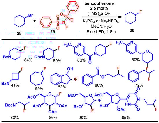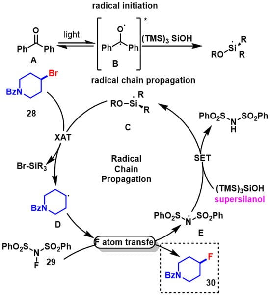 - Lovett, G.H.; Chen, S.; Xue, X.-S.; Houk, K.N.; MacMillan, D.W.C. Open-Shell Fluorination of Alkyl Bromides: Unexpected Selectivity in a Silyl Radical-Mediated Chain Process. J. Am. Chem. Soc. 2019, 141, 20031–20036. [Google Scholar] [CrossRef]