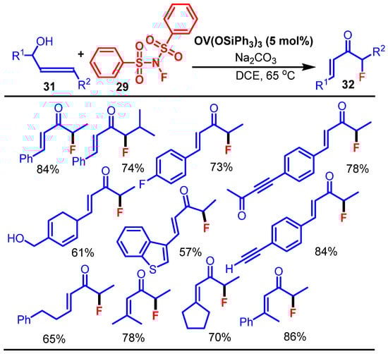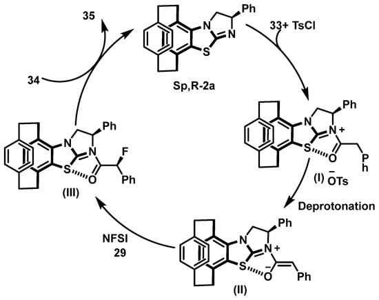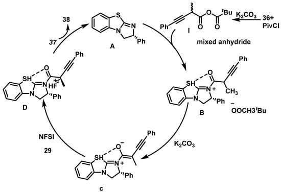 In 2021, Niwa et al. reported a structure-dependent enantioselective fluorination and fluorocyclization process of γ-substituted allylamine derivatives, using a dianionic phase-transfer catalyst derived from a chiral dicarboxylic acid. Their study explored a stereodivergent catalytic fluorination platform for acyclic allylamines bearing γ-substituents. Using a chiral dianionic phase-transfer catalyst generated in situ, Niwa et al. achieved highly enantio- and diastereoselective fluorination and fluorocyclization reactions. Their study also explored mechanistic divergence via kinetic analysis, nonlinear effect studies, and isotope labeling, demonstrating that the aggregation state of the catalyst plays a key role in the enantioselectivity [].