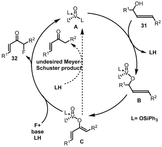 - Trost, B.M.; Tracy, J.S.; Yusoontorn, T. Vanadium-Catalyzed Coupling of Allenols with Electrophilic Halide Sources for the Formation of α-Halo-α′,β′-Unsaturated Ketones. Org. Lett. 2019, 21, 1207–1211. [Google Scholar] [CrossRef]