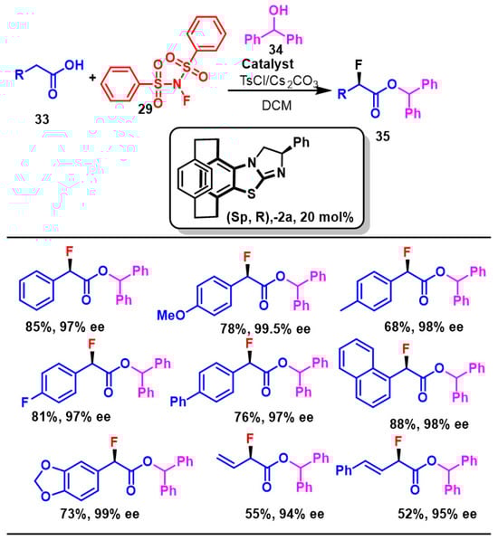 - Yuan, S.; Liao, C.; Zheng, W.-H. [2.2]Paracyclophane-Based Isothiourea-Catalyzed Highly Enantioselective α-Fluorination of Carboxylic Acids. Org. Lett. 2021, 23, 4142–4146. [Google Scholar] [CrossRef]