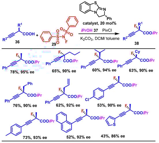 - Yuan, S.; Zheng, W.-H. Enantioselective Construction of Tertiary α-Alkyl Fluoride via BTM-Catalyzed Fluorination of α-Alkynyl-Substituted Acetic Acids. J. Org. Chem. 2022, 87, 713–720. [Google Scholar] [CrossRef] [PubMed]