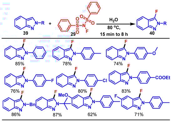 - Ghosh, P.; Hajra, A. Fluorination of 2H-Indazoles Using N-Fluorobenzenesulfonimide. J. Org. Chem. 2021, 86, 10883–10888. [Google Scholar] [CrossRef] [PubMed]