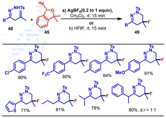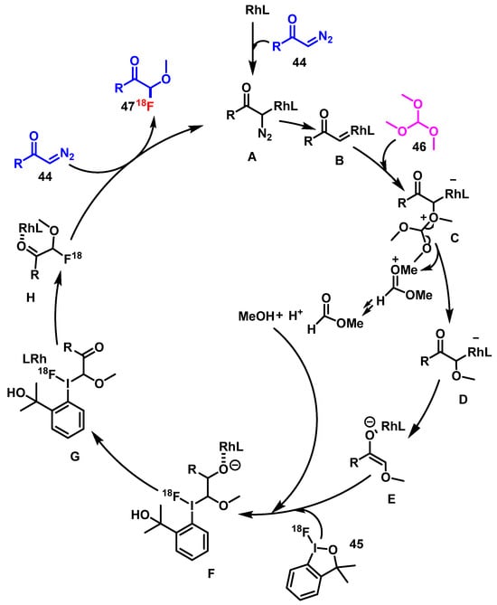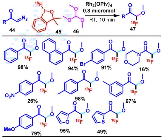 - Cortés González, M.A.; Jiang, X.; Nordeman, P.; Antoni, G.; Szabó, K.J. Rhodium-Mediated 18F-Oxyfluorination of Diazoketones Using a Fluorine-18-Containing Hypervalent Iodine Reagent. Chem. Commun. 2019, 55, 13358–13361. [Google Scholar] [CrossRef]