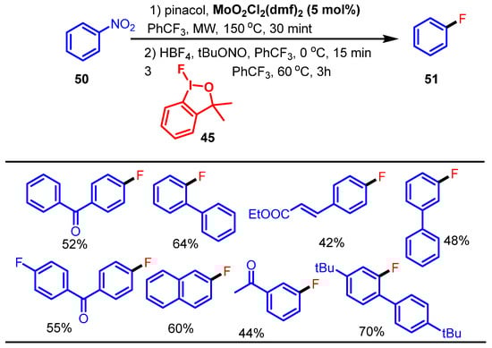 - Yang, L.; Dong, T.; Revankar, H.M.; Zhang, C. Recent Progress on Fluorination in Aqueous Media. Green Chem. 2017, 19, 3951–3992. [Google Scholar] [CrossRef]
