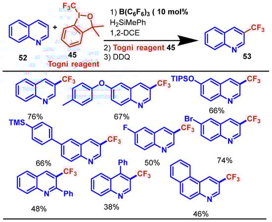- Muta, R.; Torigoe, T.; Kuninobu, Y. 3-Position-Selective C–H Trifluoromethylation of Pyridine Rings Based on Nucleophilic Activation. Org. Lett. 2022, 24, 8218–8222. [Google Scholar] [CrossRef]