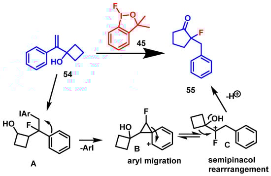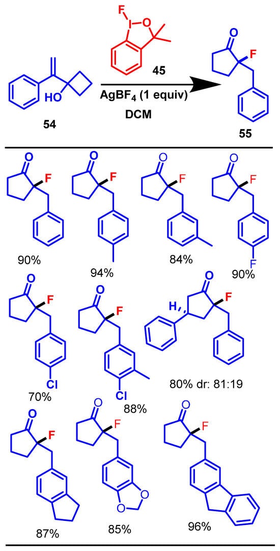 - Zhao, P.; Wang, W.; Gulder, T. Hypervalent Fluoro-Iodane-Triggered Semipinacol Rearrangements: Synthesis of α-Fluoro Ketones. Org. Lett. 2023, 25, 6560–6565. [Google Scholar] [CrossRef]