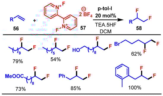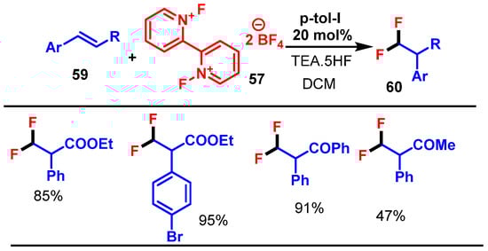 - Kitamura, T.; Kitamura, D.; Oyamada, J.; Higashi, M.; Kishikawa, Y. N,N’-Difluoro-2,2′-bipyridinium Bis(tetrafluoroborate): A New Terminal Oxidant for Iodoarene-Catalyzed Fluorination Reactions. Adv. Synth. Catal. 2023, 365, 2744–2750. [Google Scholar] [CrossRef]