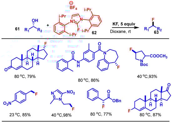 - Goldberg, N.W.; Shen, X.; Li, J.; Ritter, T. AlkylFluor: Deoxyfluorination of Alcohols. Org. Lett. 2016, 18, 6102–6104. [Google Scholar] [CrossRef] [PubMed]