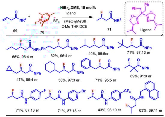 - Lee, C.; Kim, M.; Han, S.; Kim, D.; Hong, S. Nickel-Catalyzed Hydrofluorination in Unactivated Alkenes: Regio- and Enantioselective C–F Bond Formation. J. Am. Chem. Soc. 2024, 146, 9375–9384. [Google Scholar] [CrossRef] [PubMed]