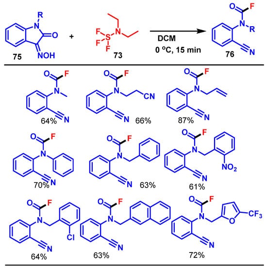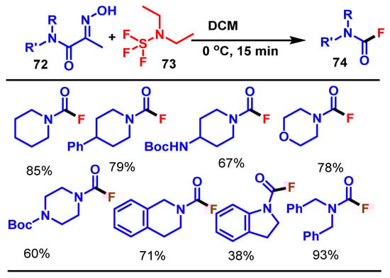 - Song, J.W.; Lim, H.N. Synthesis of Carbamoyl Fluorides via a Selective Fluorinative Beckmann Fragmentation. Org. Lett. 2021, 23, 5394–5399. [Google Scholar] [CrossRef]