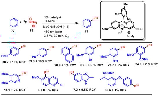 - Chen, W.; Huang, Z.; Tay, N.E.S.; Giglio, B.; Wang, M.; Wang, H.; Wu, Z.; Nicewicz, D.A.; Li, Z. Direct Arene C–H Fluorination with 18F− via Organic Photoredox Catalysis. Science 2019, 364, 1170–1174. [Google Scholar] [CrossRef]