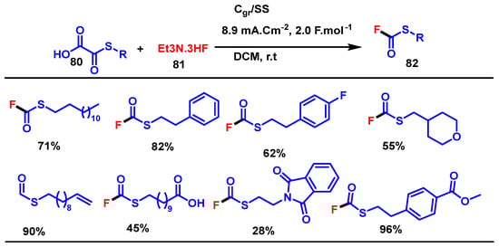 Pulikkottil et al. (2025) reported the synthesis of fluorothioformates via electrochemical fluorination of oxalic acid monothioesters using triethylamine trihydrofluoride (Et3N·3HF) 80 as both fluorine source and electrolyte. This method involves the electrochemical oxidation of oxalic acid monothioesters (80) in DCM under a current density of 8.9 mA/cm2 using a platinum cathode, a carbon anode, and two equivalents of Et3N·3HF 81. The oxidative process generates a reactive carbonyl sulfide intermediate that is captured by fluoride to form the fluorothioformate product (82) (Scheme 49) [].
