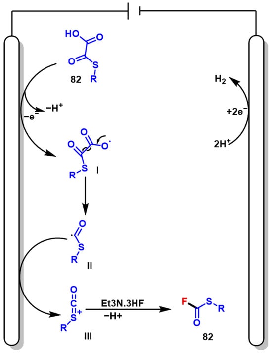 The proposed mechanism begins with the anodic oxidation of the oxalic acid monothioester (80) to yield a carboxyl radical (I), which rapidly undergoes decarboxylation to form an oxythiocarbonyl radical (II). This intermediate loses an electron to become a sulfonium cation (III), a highly electrophilic species that reacts with fluoride from Et3N·3HF to afford the fluorothioformate product (82) (Scheme 50).