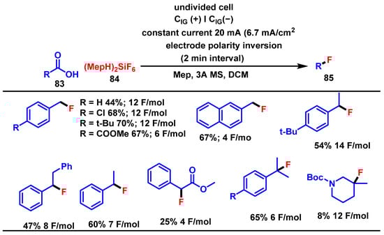 Köpfler et al. (2025) reported the synthesis of bis(5-ethyl-2-methylpyridin-1-ium) hexafluorosilicate (IV), a novel and soluble hexafluorosilicate salt, and demonstrated its use as an efficient nucleophilic fluorine source for electrochemical transformations. This reaction involves the electrochemical decarboxylative fluorination of aliphatic carboxylic acids (83) using (MepH)2SiF6 84 via anodic oxidation in DCM. The optimal conditions included undivided cells with impervious graphite electrodes, a current density of 6.66 mA/cm2, and alternating electrode polarity every 2 min at room temperature. The reaction uses 12 F/mol of charge, affording fluorinated product 85 with high selectivity (Scheme 51) [].