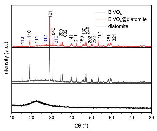 The crystal structure of BiVO4@diatomite was investigated, and its XRD pattern is presented in Figure 1. According to the standard card (JCPDS 14-0688), as shown in Figure 1, the peaks at 2θ = 18.76°, 28.97°, 30.60°, 34.54°, 35.31°, 40.10°, 42.50°, 46.09°, 46.78°, 47.37°, 49.94°, 50.26°, 53.23°, 58.32°, and 59.68° correspond to the characteristic diffraction peaks of monoclinic BiVO4, attributed to the (110), (121), (040), (200), (002), (141), (211), (150), (132), (240), (042), (202), (222), (161), (251), and (321) crystal planes, respectively. These results confirm that BiVO4 was successfully synthesized without being coated by diatomite and that its crystalline transformation occurred. The XRD pattern of BiVO4@diatomite in Figure 1 shows a trend similar to that of natural diatomite. Based on the standard card (JCPDS 85-0621), the peaks at 2θ = 17.50°, 21.48°, 27.83°, and 30.56° are identified as the characteristic diffraction peaks of SiO2, corresponding to the (110), (111), (012), and (211) crystal planes, respectively. The distinct and intense diffraction peaks with minimal impurity peaks indicate that BiVO4@diatomite possesses good crystallinity and high purity. The XRD pattern of diatomite exhibits a broad and diffuse diffraction peak, indicative of an amorphous structure [20].