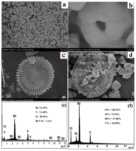 SEM image of (a,b) BiVO4; (c) acid-washed diatomite; (d) BiVO4@diatomite and EDS analysis of (e) BiVO4; and (f) BiVO4@diatomite.