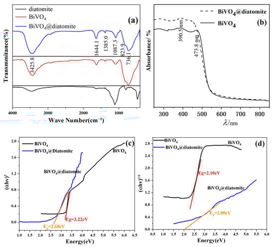 Infrared spectra (a) and UV-Vis diffuse reflectance (DRS) spectrum (b) of BiVO4 and BiVO4@diatomite; (c) fit curves of (αhν)2~hν plots; and (d) fit curves of (αhν)1/2~hν plots.