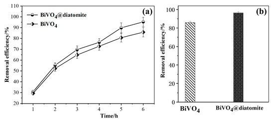 Figure 4a,b compare the degradation efficiencies of methoxychlor by BiVO4@diatomite and BiVO4 under the conditions of Cmethoxychlor = 40 mg/L, pH = 8, illumination intensity: 32.2 × 103 μW/cm2, and dosage of catalyst: 5.28 g/L. With the extension of the illumination time, the degradation efficiency of methoxychlor exhibits a gradually increasing trend. After 6 h of illumination, the removal efficiency of methoxychlor by BiVO4@diatomite reached 95.35%, which is higher than that of BiVO4 (85.82%) under the same conditions. This indicates that BiVO4@diatomite demonstrates superior photocatalytic degradation performance. This enhanced performance may be attributed to the ideal pore channels provided by diatomite, which facilitate the vertical growth of BiVO4 nanosheets on diatomite disks. Additionally, the chemical combination between BiVO4 and diatomite improves the thermal stability of BiVO4, hinders its aggregation, and increases the specific surface area from 1.5 m2/g to 4.89 m2/g (Table 1). These factors enhance the contact area between BiVO4 and methoxychlor, thereby promoting photocatalytic degradation. Furthermore, methoxychlor can be continuously transferred to the surface of BiVO4 through adsorption by diatomite, ensuring sustained photocatalytic degradation until the complete removal of methoxychlor is achieved [32].
