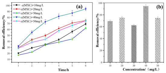 (a) The removal effects of different initial concentration over time; (b) Maximum removal efficiency of different initial concentration. Degradation condition: pH = 8, illumination intensity: 32.2 × 103 μW/cm2, and dosage of catalyst: 5.28 g/L.