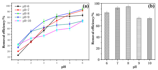 As shown in Figure 6a, under different pH conditions, with the extension of the illumination time, the degradation efficiency of methoxychlor exhibited a gradual increasing trend. Notably, at a solution pH of 8, the degradation efficiency was the highest at each time point, reaching a maximum value of 94.31% after 6 h of light exposure. This suggests that the degradation efficiency of methoxychlor initially increases with rising pH, reaching its peak at 94.31% under pH 8 (Figure 6b). However, when the pH of the solution was increased to 9 or 10, the degradation rate decreased significantly. Therefore, the photocatalytic activity of BiVO4@diatomite under different pH conditions has the following order: pH = 8 > pH = 7 > pH = 6 > pH = 9 > pH = 10. These results demonstrate that the degradation of methoxychlor by BiVO4@diatomite is highly sensitive to pH.