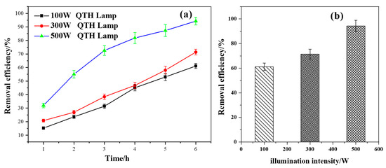 It can be inferred that the enhancement in degradation efficiency can be attributed to the fact that, as the photocatalytic reaction progresses, a higher-intensity light source generates more photons, thereby exciting more valence-band electrons and increasing the generation rate of photogenerated electron–hole pairs. This enhanced generation rate [36] facilitates the rapid progression of the photocatalytic oxidation reaction.
