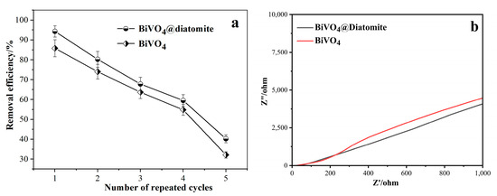 Reuse activity of BiVO4@diatomite. (a) Electrochemical impedance spectroscopy of BiVO4 and BiVO4@diatomite. (b) Degradation condition: CMETHOXYCHLOR = 40 mg/L, pH = 8, illumination intensity: 32.2 × 103 μW/cm2, and dosage of catalyst: 5.28 g/L.