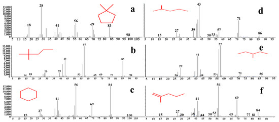 Mass spectrum of methoxychlor degraded by BiVO4@Diatomite. (a) 1,1-dimethylcyclopentane; (b) 2,2-dimethylpentane; (c) cyclohexane; (d) 2-methylpentane; (e) 3-methylpentane; (f) 2-methyl-1-pentene.