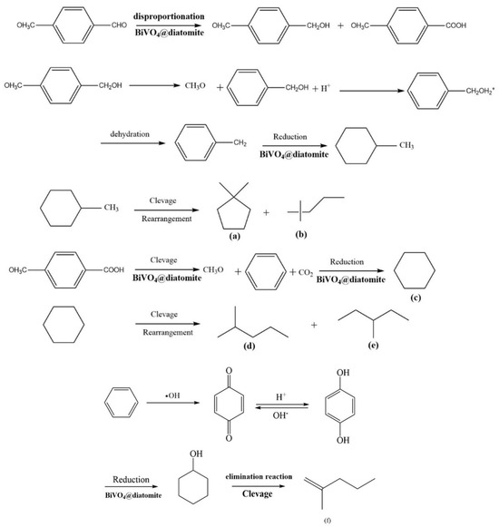 P-methoxybenzaldehyde undergoes disproportionation into methoxybenzyl alcohol and p-methoxybenzoic acid under redox conditions mediated by BiVO4@diatomite. Methoxybenzyl alcohol is subsequently demethoxylated, protonated, dehydrated to form methylbenzene, and further reduced to methylcyclohexane via the action of BiVO4@diatomite. Methylcyclohexane is then cleaved and rearranged into 1, 1-dimethylcyclopentane (a) and 2, 2-dimethylpentane (b). Simultaneously, p-methoxybenzoic acid undergoes demethoxylation and decarboxylation to produce a benzene ring, which is subsequently reduced to cyclohexane (c). Cyclohexane further splits into 2-methylpentane (d) and 3-methylpentane (e). The formation of 2-methyl-1-pentene (f) involves a more complex process. Following the demethoxylation and decarboxylation of p-methoxybenzoic acid, the benzene ring is oxidized to benzoquinone by hydroxyl radicals. Benzoquinone undergoes proton exchange to form p-hydroxyphenol, which is subsequently reduced to hydroxycyclohexane [38], Hydroxycyclohexane is then eliminated and cleaved to yield 2-methyl-1-pentene (f).