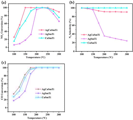 After determining the optimal silver doping ratio, the effect of Ag modification on catalytic performance was further investigated by comparing the NH3-SCR and CO oxidation activities of AgCuSmTi, CuSmTi, and AgSmTi catalysts. Figure 1a presents the NOx conversion profiles of the three catalysts. The CuSmTi catalyst achieves complete NOx conversion at 200 °C; however, its activity declines significantly at temperatures above 250 °C. Notably, the introduction of Ag markedly enhances low-temperature performance, enabling the AgCuSmTi catalyst to reach 100% NOx conversion at 150 °C (T100% = 150 °C). In contrast, the AgSmTi catalyst, which lacks Cu species, exhibits poor performance, achieving full NOx conversion only between 225 and 250 °C. These results indicate that Ag species strongly interact with CuSmTi and play a crucial role in promoting the NH3-SCR reaction. Figure 1b shows the N2 selectivity of the three catalysts. The AgSmTi catalyst exhibits a sharp decrease in N2 selectivity above 150 °C. Although the addition of Ag slightly lowers the N2 selectivity compared to CuSmTi, the AgCuSmTi catalyst maintains over 90% selectivity across the entire temperature range of 50–300 °C. This suggests that the interaction between Ag and Cu not only enhances catalytic activity but also contributes to the preservation of high N2 selectivity. The CO oxidation performance, shown in Figure 1c, further confirms the beneficial effect of Ag modification. Among the three catalysts, AgCuSmTi exhibits the lowest T100% value. At any given temperature within the tested range, its CO conversion rate is slightly higher than that of CuSmTi, whereas AgSmTi shows relatively poor performance. This indicates that the synergistic interaction between Ag and CuSmTi plays a key role in enhancing CO oxidation activity as well. The TOF values for NO and CO conversion over the AgCuSmTi and CuSmTi catalysts are presented in Figure S2a and Figure S2b, respectively. The results clearly demonstrate that the incorporation of Ag significantly enhances the TOF values associated with the Cu species. Consequently, the AgCuSmTi catalyst exhibits markedly higher catalytic efficiency compared to the CuSmTi catalyst.